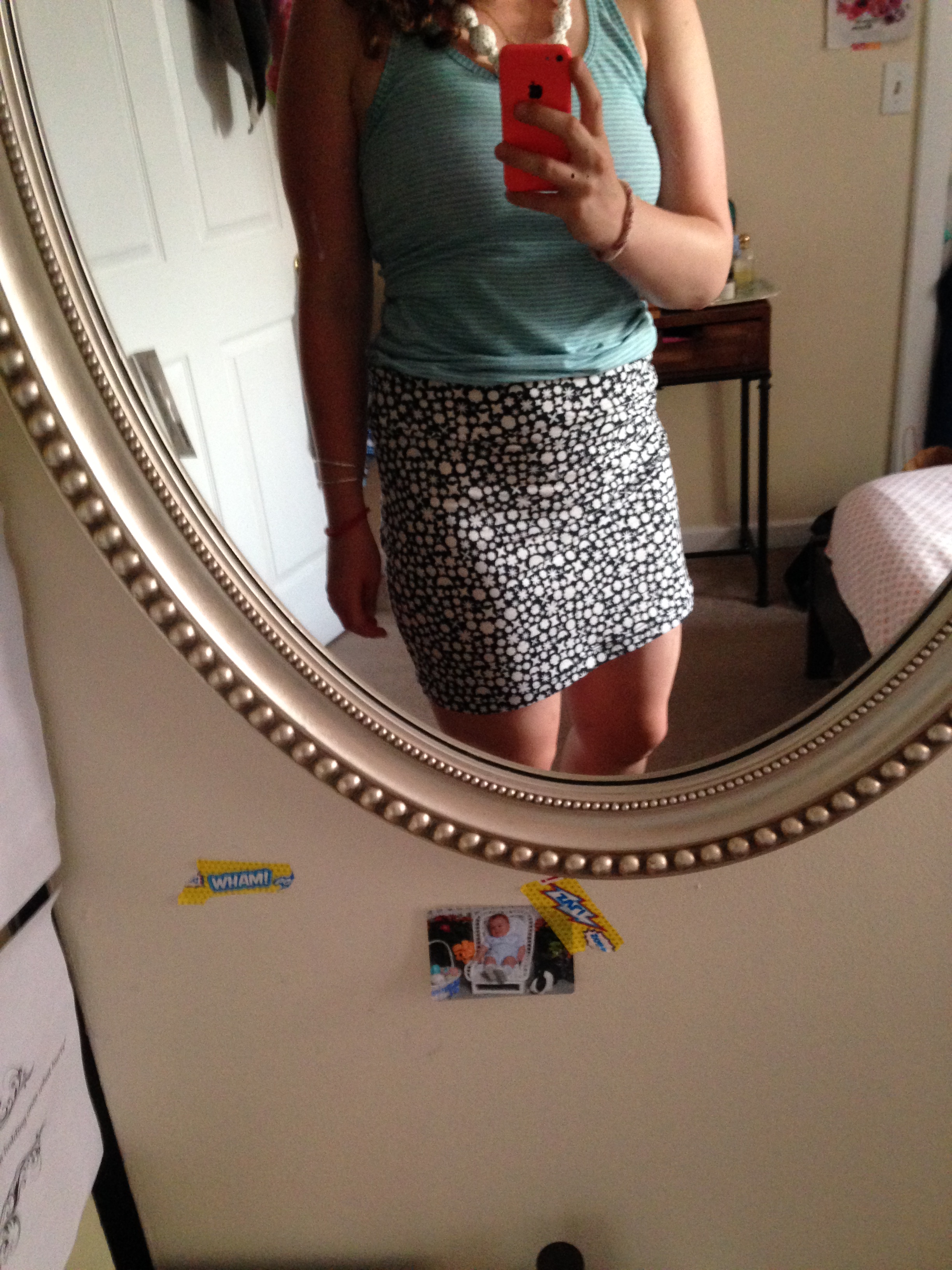 Pre wash or you’ll cut 17 inches with 3/8″ seam allowance, but wind up with a super mini skirt, which I am pretty sure will be my story. I wanted something I could wear in public, drop-things-and-bend-over-to-pick-up-without– flashing-passerby, and that would pass the high school test (hem in line at least with your longest finger, when your arms straight pressed to your sides).