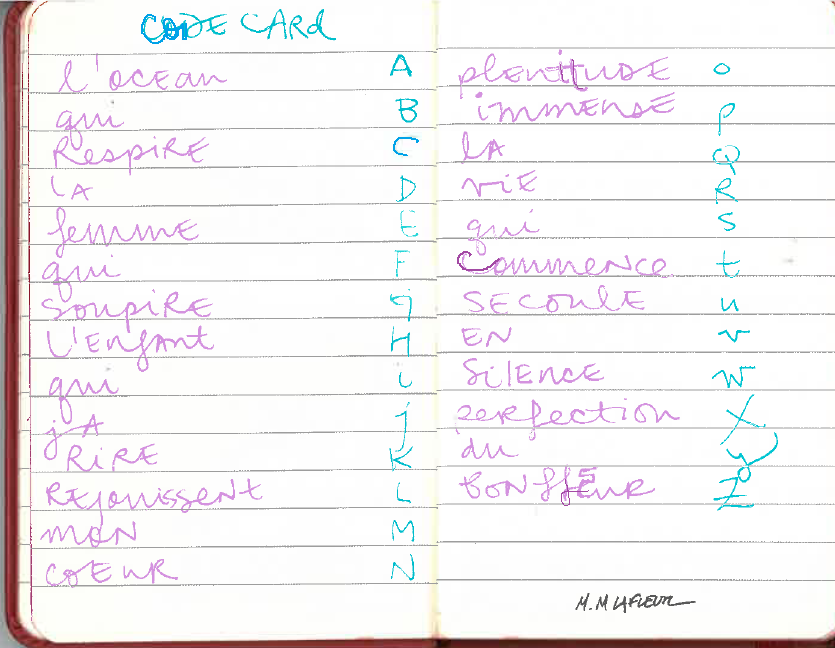 I’m really interested in language, symbolic, design, and I’ve been investigating the Resistance members’ code books. Mulley’s book includes a few images of Granville’s code book, and variations of coded alphabet she used during the War. I wrote out Granville’s code so I could try to imagine how it felt to transfer from mind to paper.